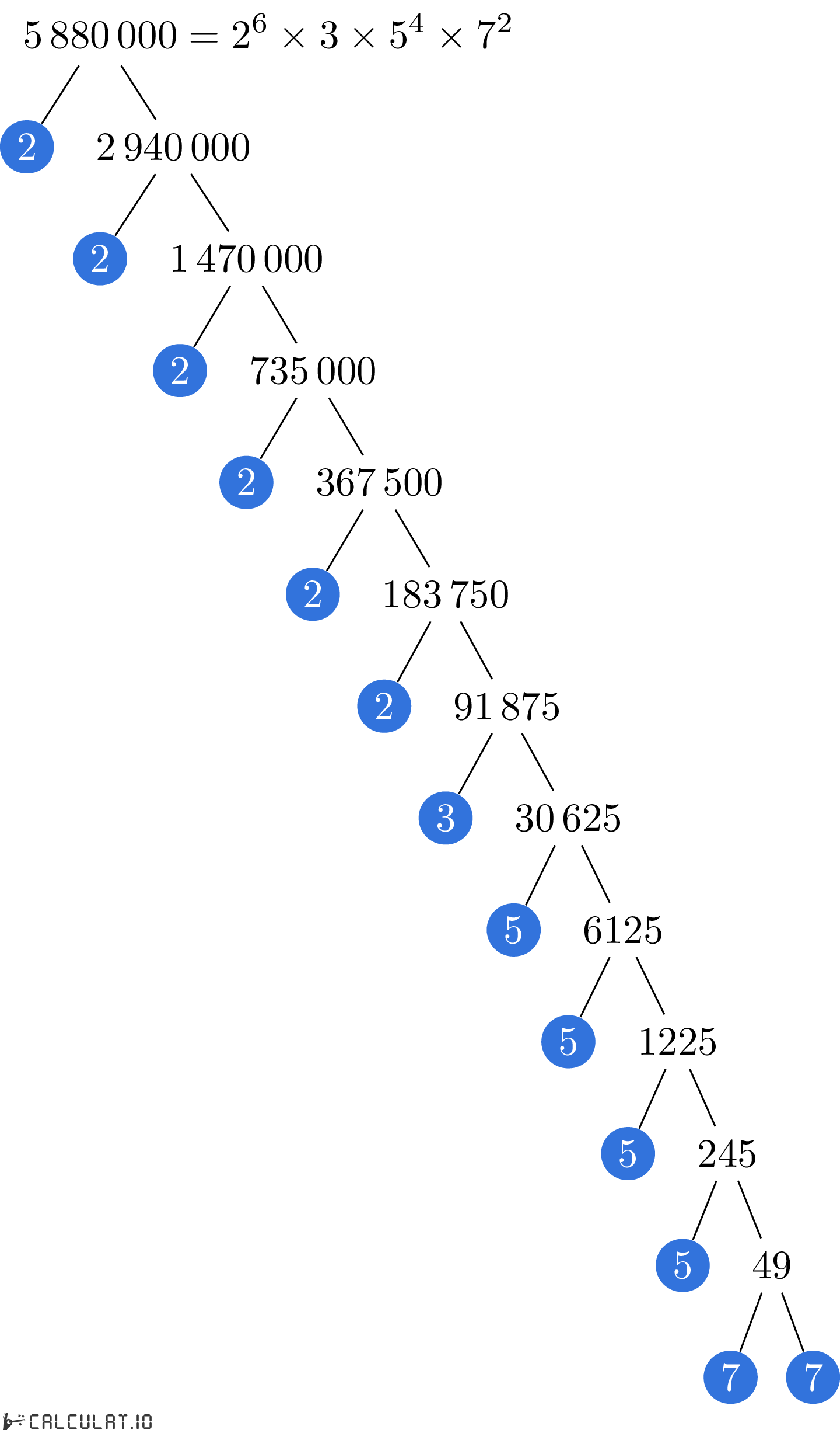 Fatores Primários de 5880000: 2, 2, 2, 2, 2, 2, 3, 5, 5, 5, 5, 7, 7