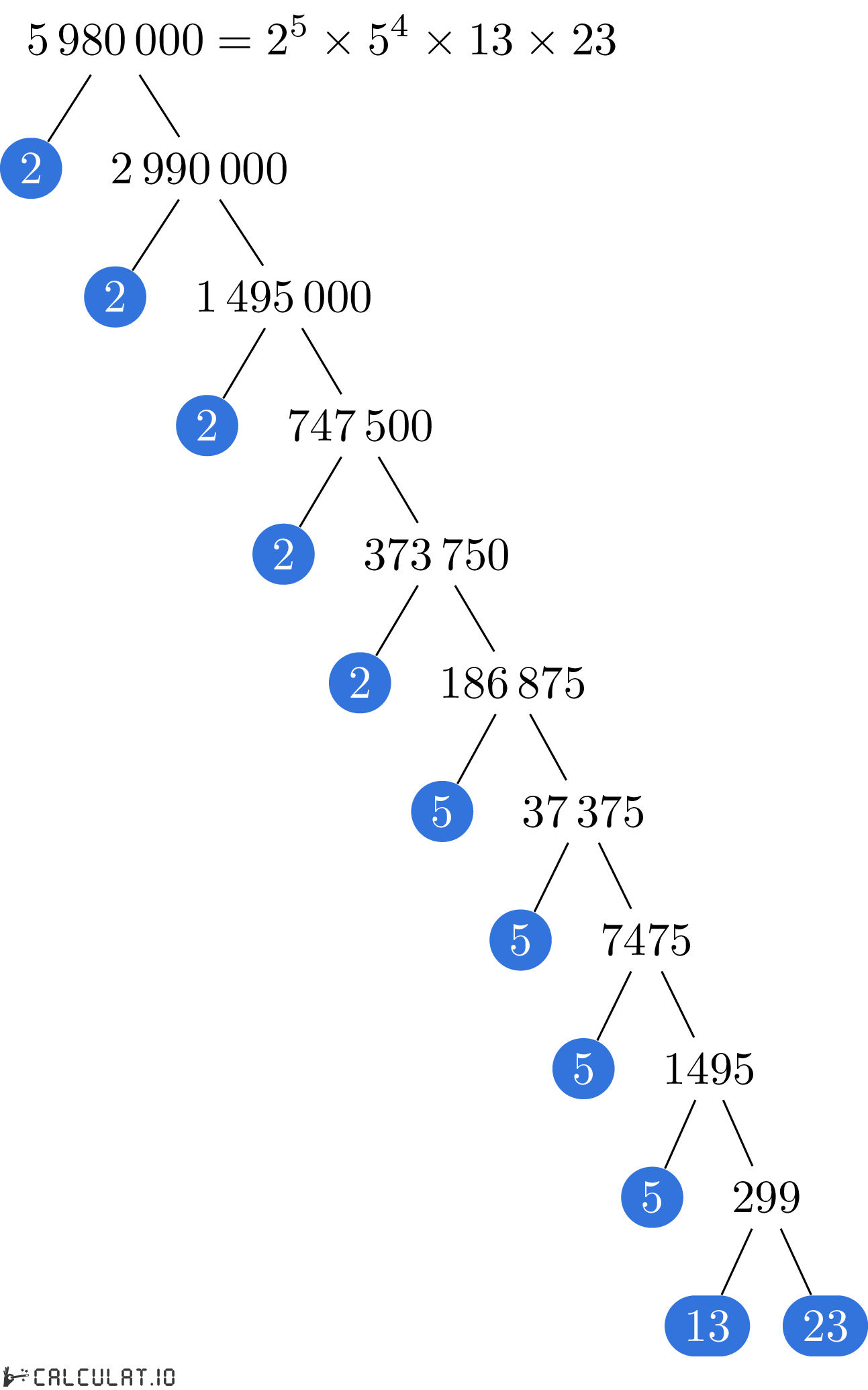 Fatores Primários de 5980000: 2, 2, 2, 2, 2, 5, 5, 5, 5, 13, 23