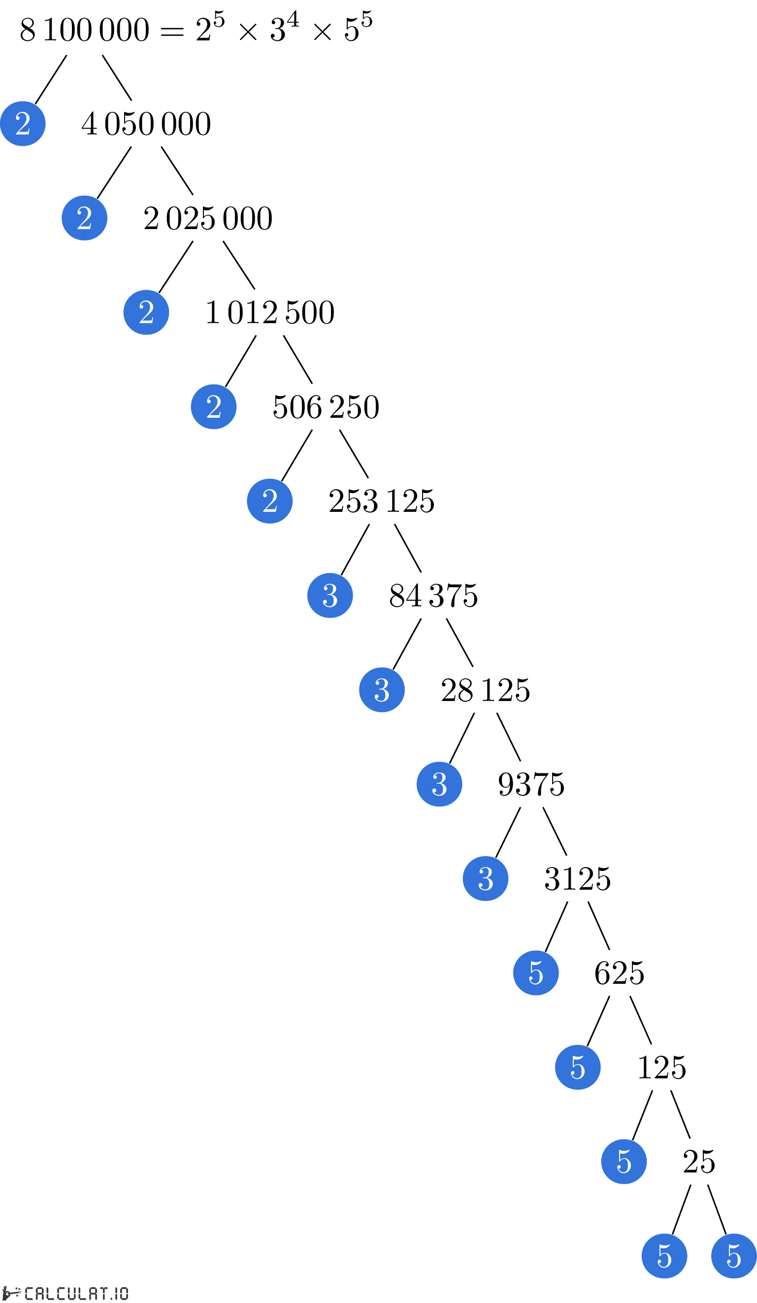 Fatores Primários de 8100000: 2, 2, 2, 2, 2, 3, 3, 3, 3, 5, 5, 5, 5, 5