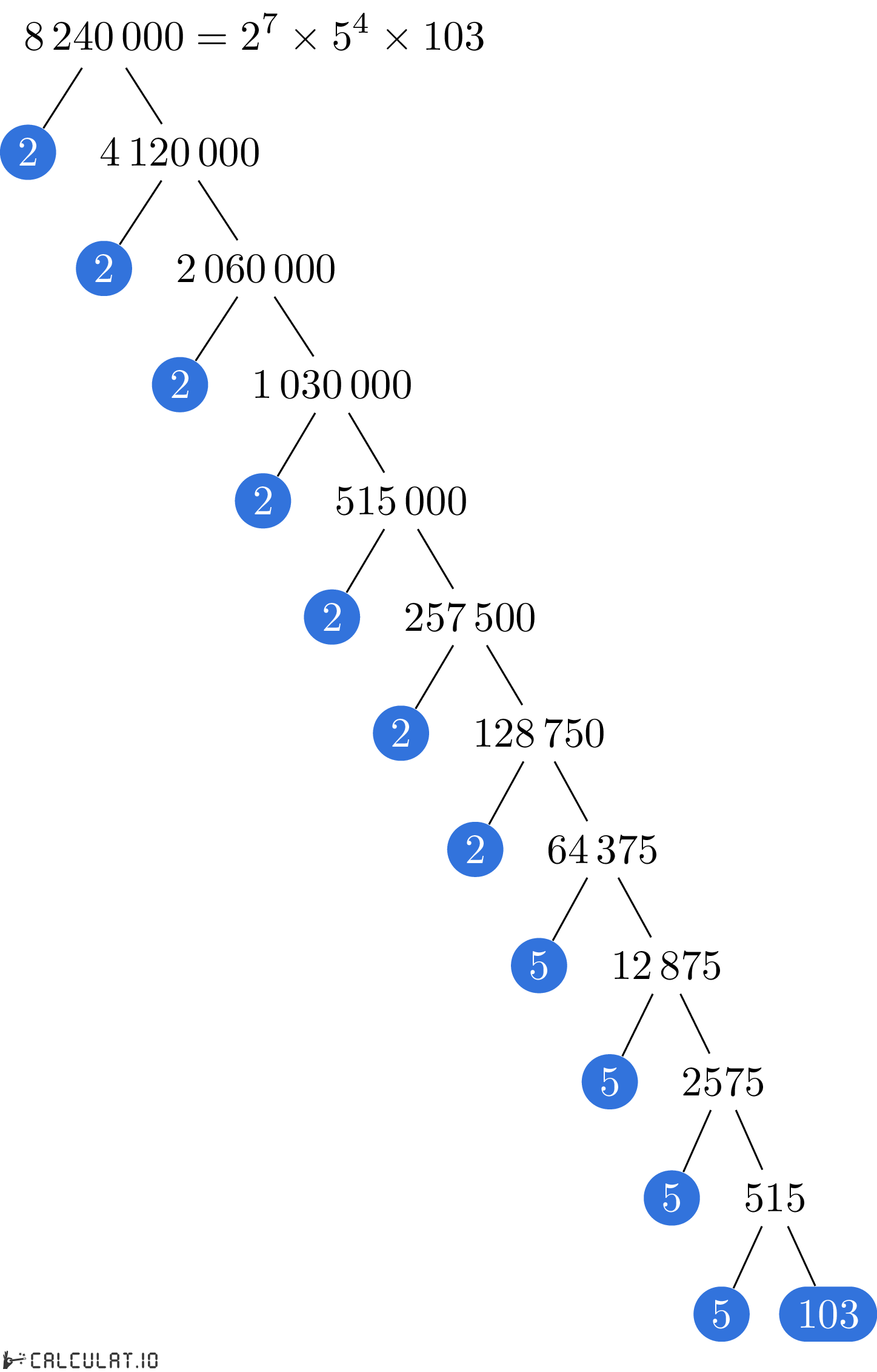 Fatores Primários de 8240000: 2, 2, 2, 2, 2, 2, 2, 5, 5, 5, 5, 103