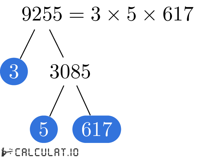 Esta calculadora realizará a fatoração prima de qualquer número dado e mostrará todos os seus fatores primos. Por exemplo, pode ajudá-lo a descobrir qual é a fatoração prima de 9255? (A resposta é: 3, 5, 617). Escolha o número para a fatoração (por exemplo, '9255'). Depois pressione o botão 'Calcular'.