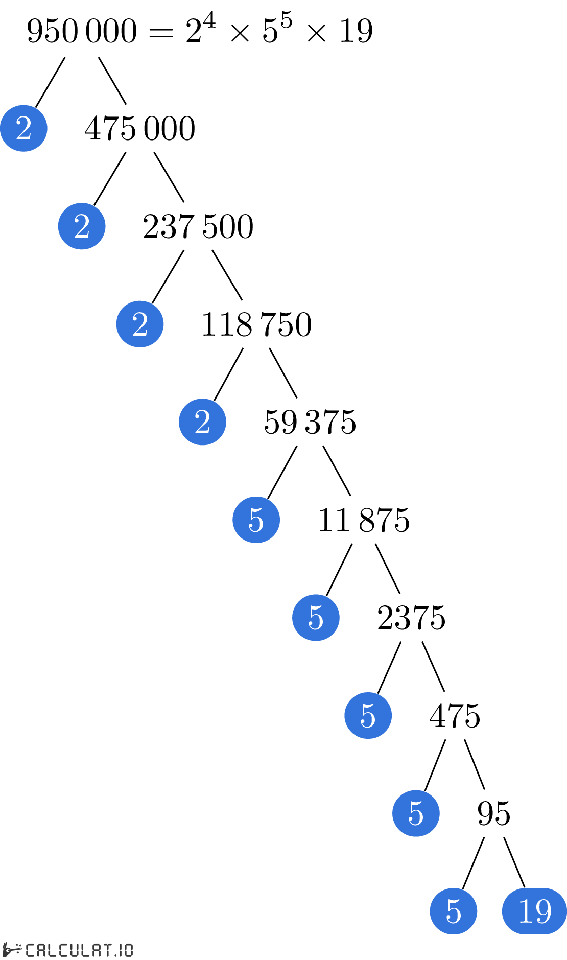 Fatores Primários de 950000: 2, 2, 2, 2, 5, 5, 5, 5, 5, 19