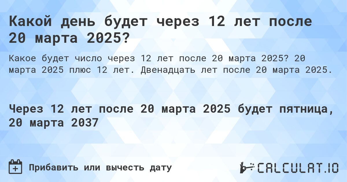 Какое будет число через 12 лет после 20 марта 2025?