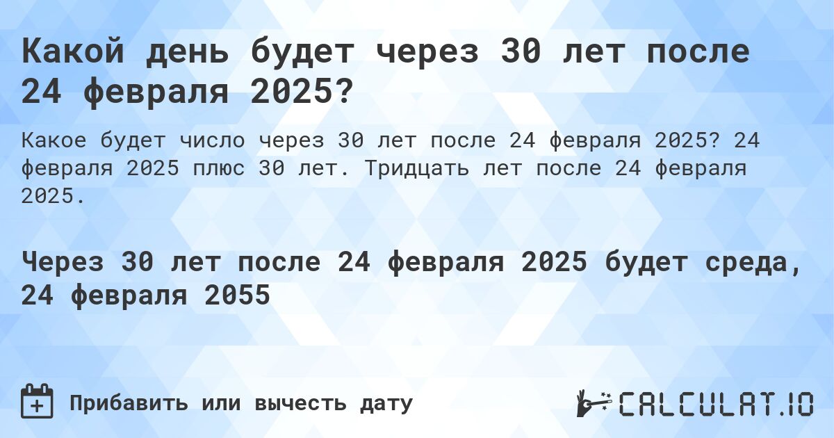 Онлайн калькулятор для сложения или вычитания дат - это удобный инструмент для тех, кто хочет быстро и легко прибавить или вычесть даты в прошлом или будущем. С помощью данного калькулятора вы можете прибавлять или вычитать любое количество дней, недель, месяцев или лет от заданной даты и узнать, какой это будет день. Например, он поможет узнать какое будет число через 30 лет после 24 февраля 2025? (Ответ: 24 февраля 2055).
