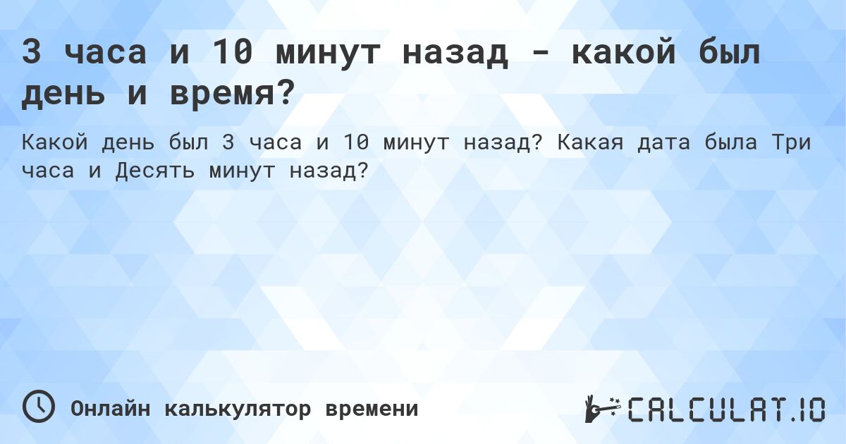 Чтобы использовать калькулятор времени, просто введите количество дней, часов и минут, которые вы хотите прибавить или вычесть из текущего времени. Например, если вы хотите узнать, 3 часа и 10 минут назад - какой был день и время?, просто введите '0 дней', '3 часа' и '10 минут' в соответствующие поля.
