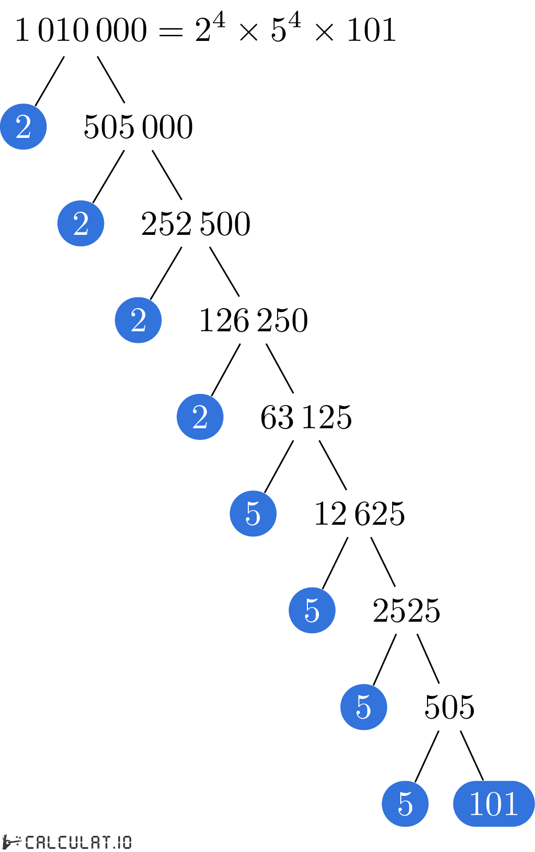 Для того, чтобы получить список простых множителей числа 1010000, необходимо итеративно делить число 1010000 на минимально возможное простое число пока в результате не получится 1 (единица).