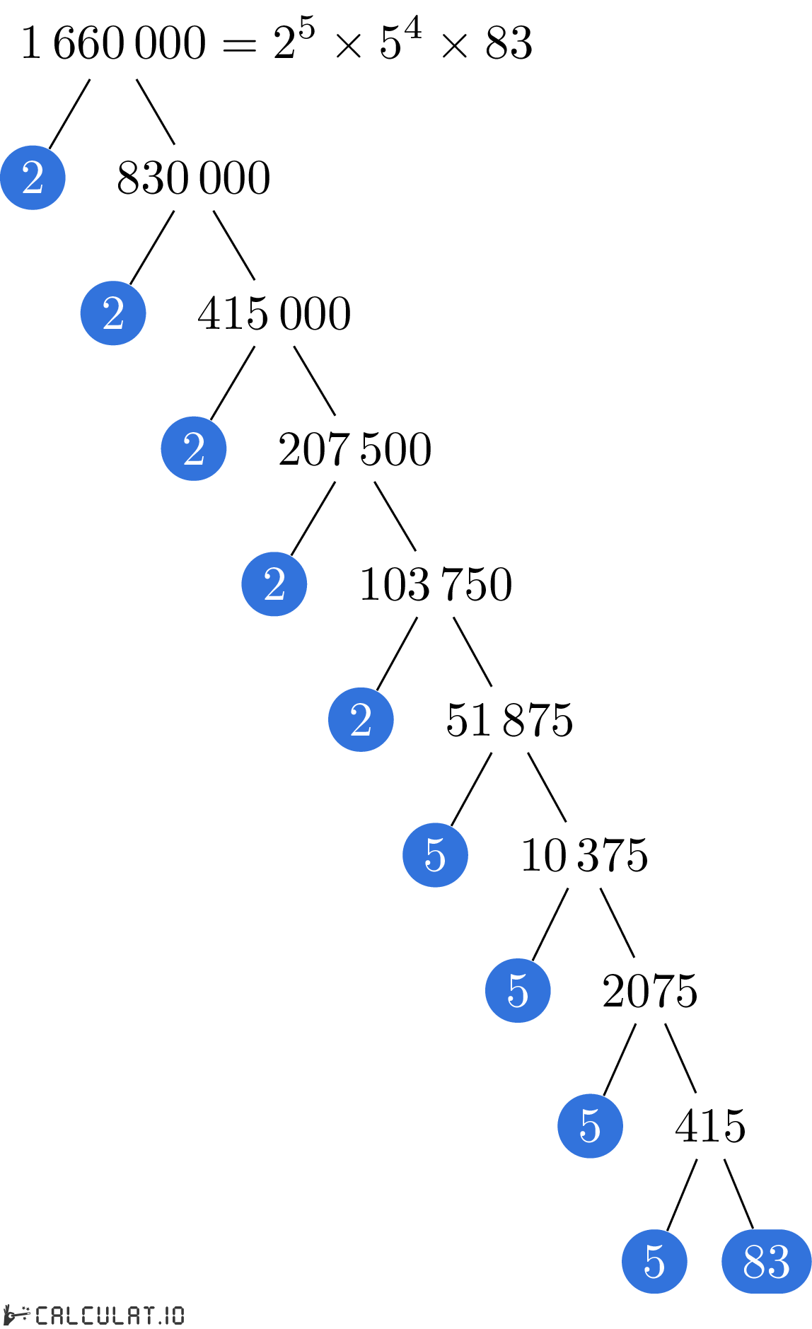 Для того, чтобы получить список простых множителей числа 1660000, необходимо итеративно делить число 1660000 на минимально возможное простое число пока в результате не получится 1 (единица).
