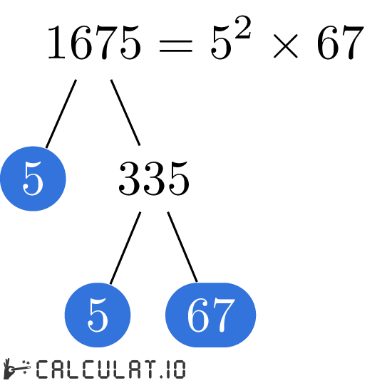 Для того, чтобы получить список простых множителей числа 1675, необходимо итеративно делить число 1675 на минимально возможное простое число пока в результате не получится 1 (единица).