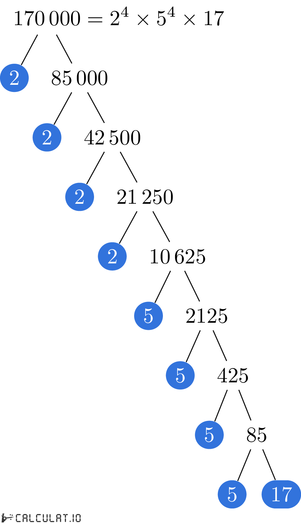 Для того, чтобы получить список простых множителей числа 170000, необходимо итеративно делить число 170000 на минимально возможное простое число пока в результате не получится 1 (единица).