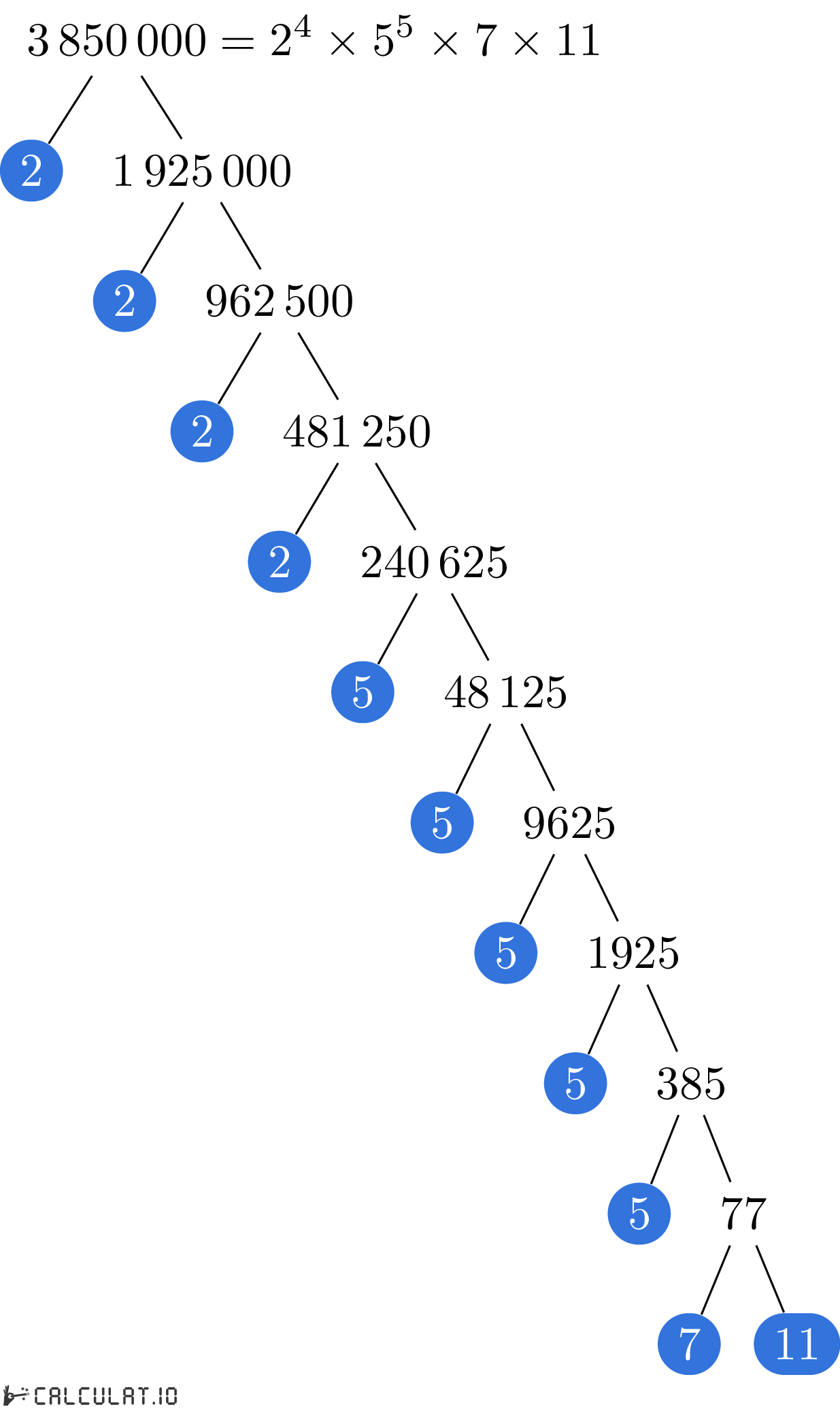 Для того, чтобы получить список простых множителей числа 3850000, необходимо итеративно делить число 3850000 на минимально возможное простое число пока в результате не получится 1 (единица).