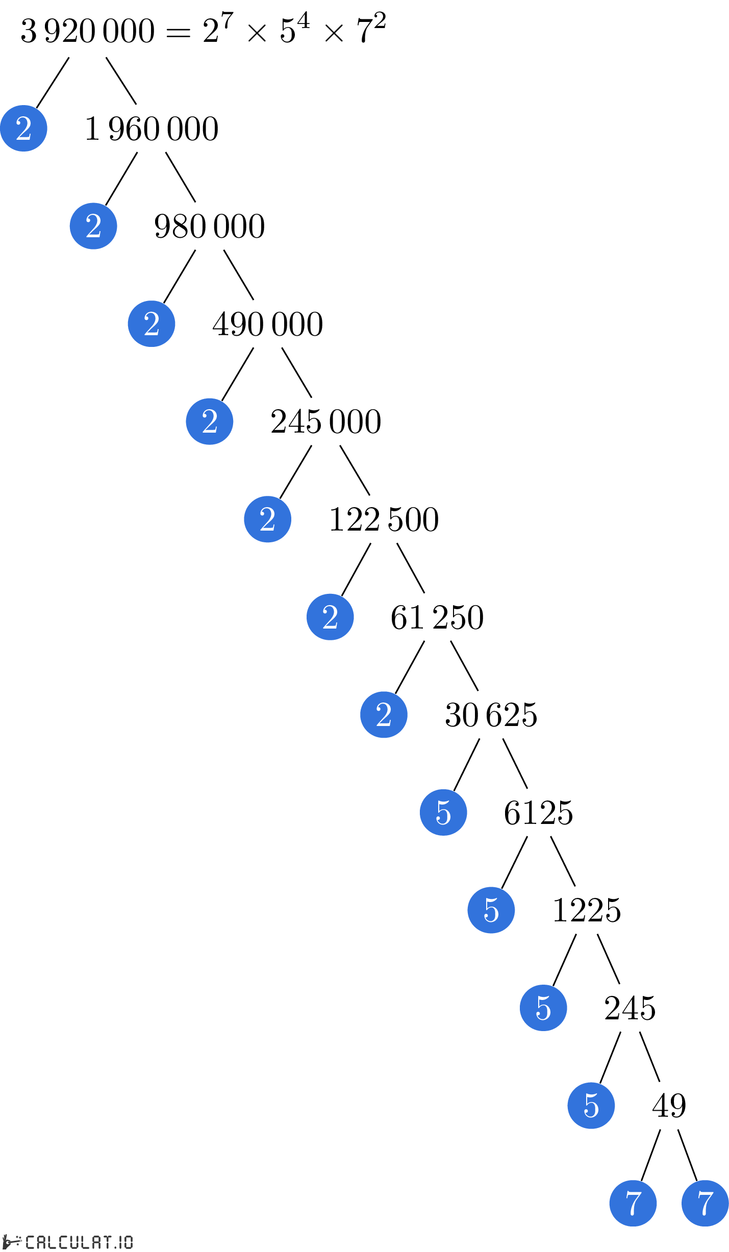В итоге мы получили список всех простых множителей числа 3920000. Это: 2, 2, 2, 2, 2, 2, 2, 5, 5, 5, 5, 7, 7