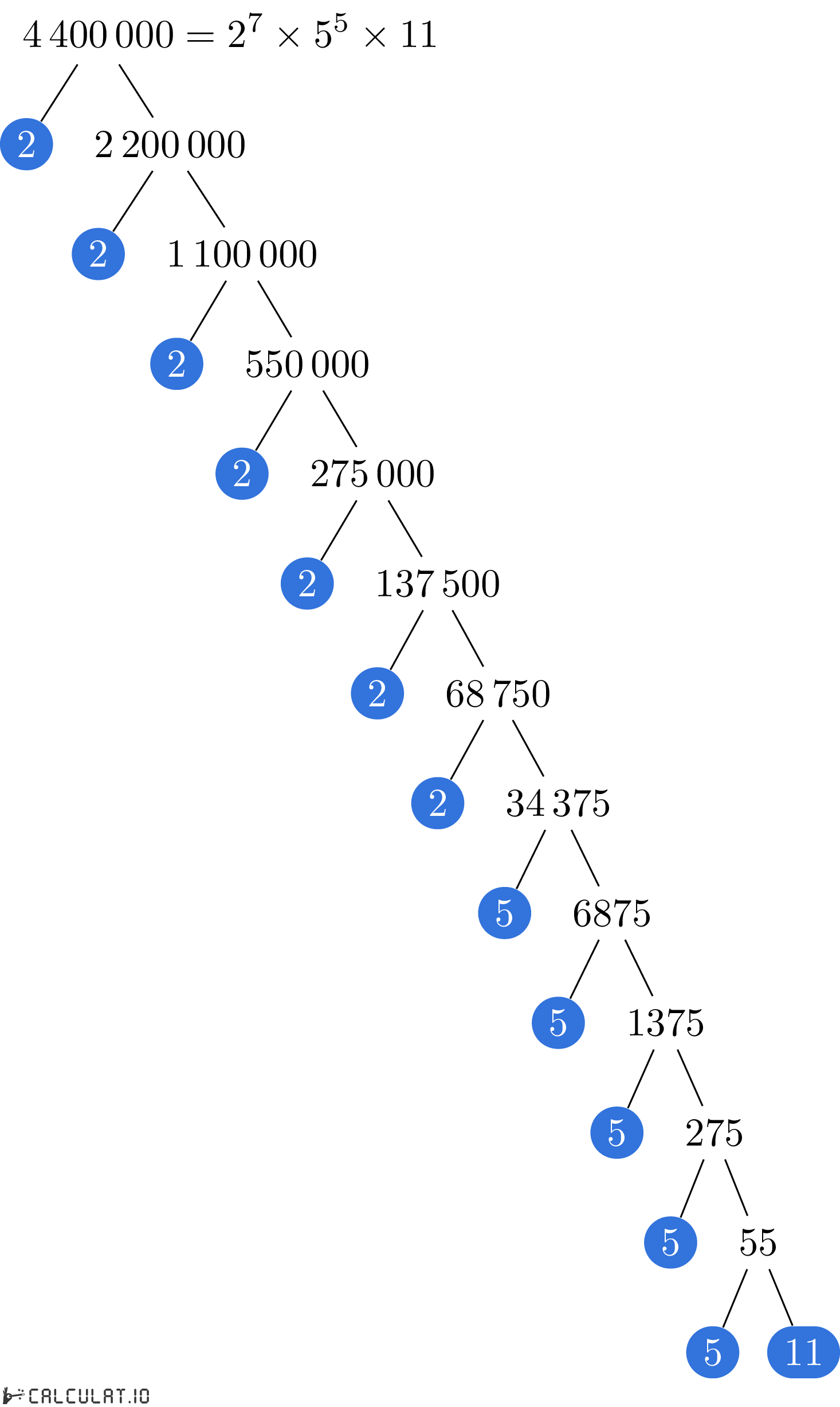 Для того, чтобы получить список простых множителей числа 4400000, необходимо итеративно делить число 4400000 на минимально возможное простое число пока в результате не получится 1 (единица).
