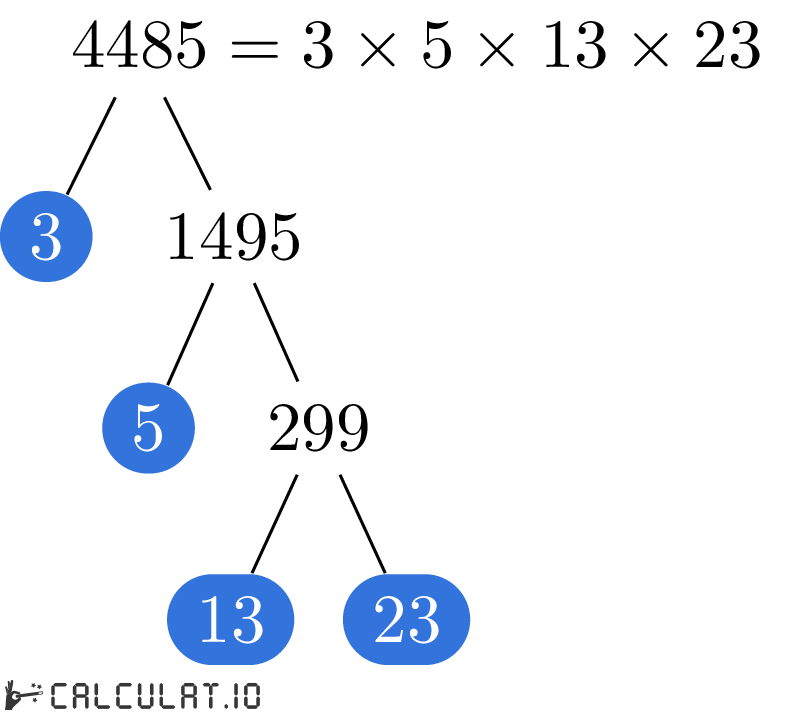 Для того, чтобы получить список простых множителей числа 4485, необходимо итеративно делить число 4485 на минимально возможное простое число пока в результате не получится 1 (единица).