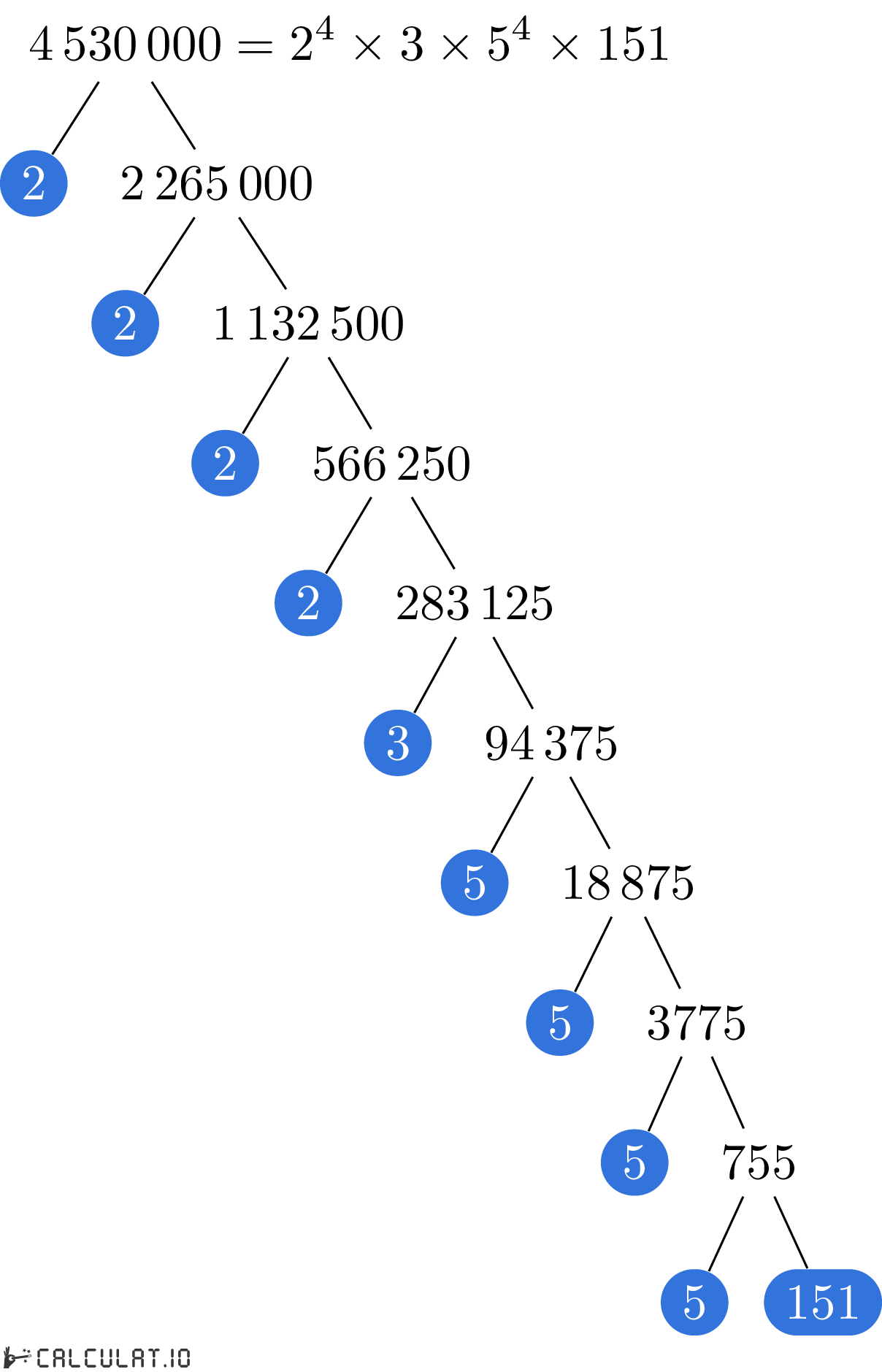 Для того, чтобы получить список простых множителей числа 4530000, необходимо итеративно делить число 4530000 на минимально возможное простое число пока в результате не получится 1 (единица).