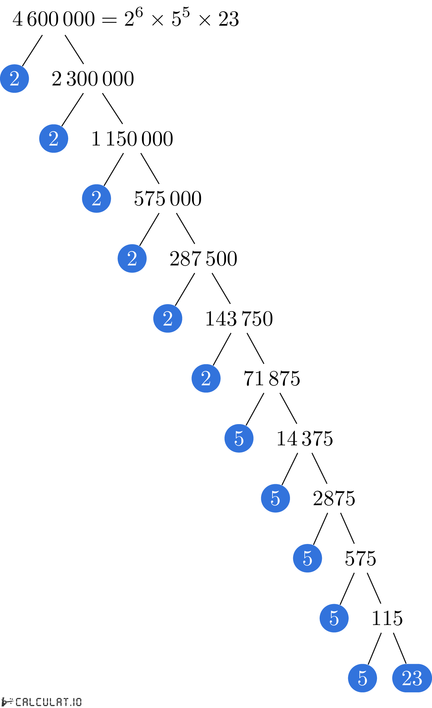 Для того, чтобы получить список простых множителей числа 4600000, необходимо итеративно делить число 4600000 на минимально возможное простое число пока в результате не получится 1 (единица).