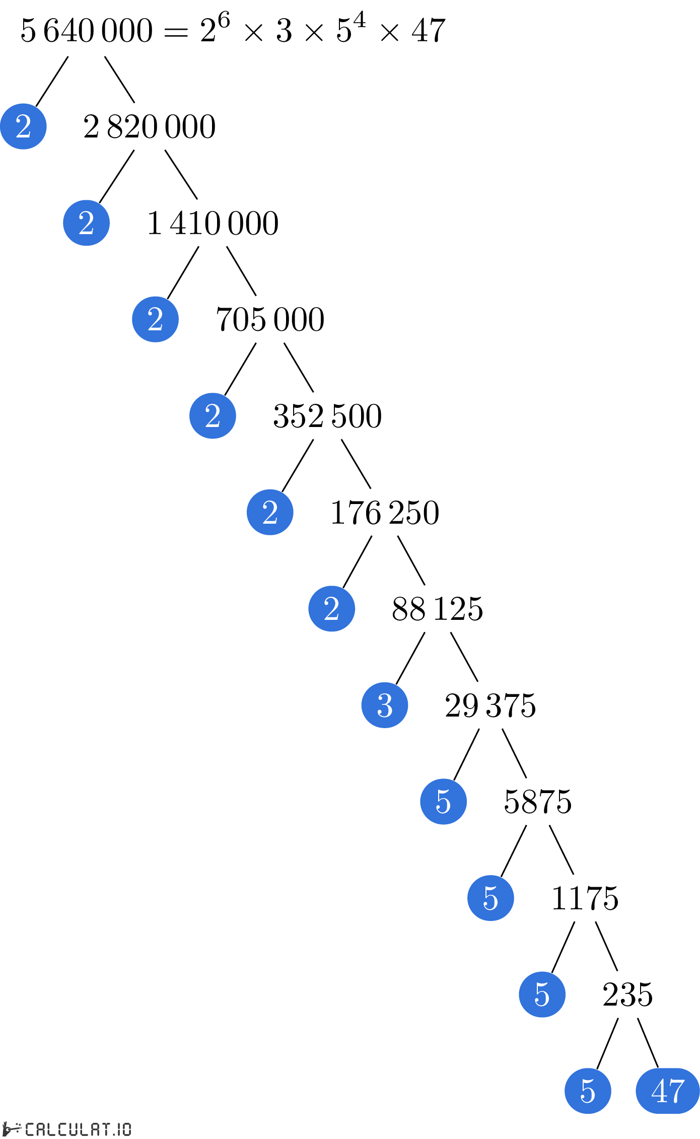 Для того, чтобы получить список простых множителей числа 5640000, необходимо итеративно делить число 5640000 на минимально возможное простое число пока в результате не получится 1 (единица).