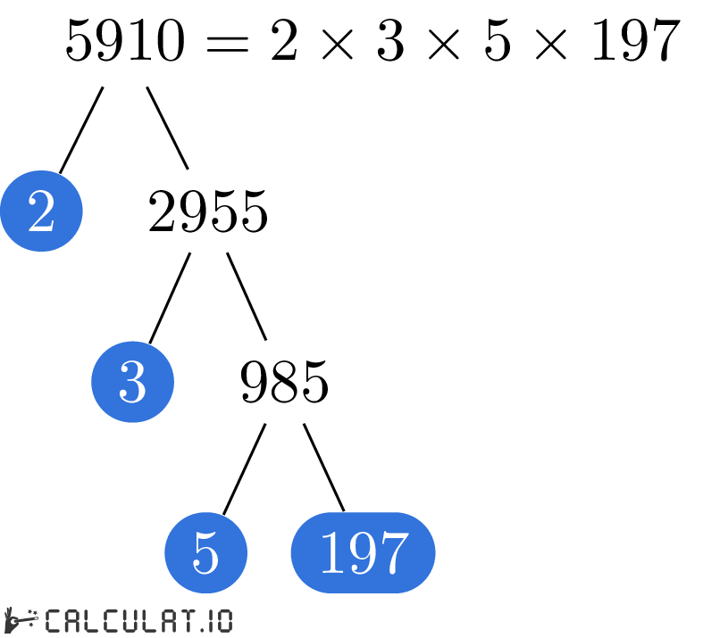В итоге мы получили список всех простых множителей числа 5910. Это: 2, 3, 5, 197
