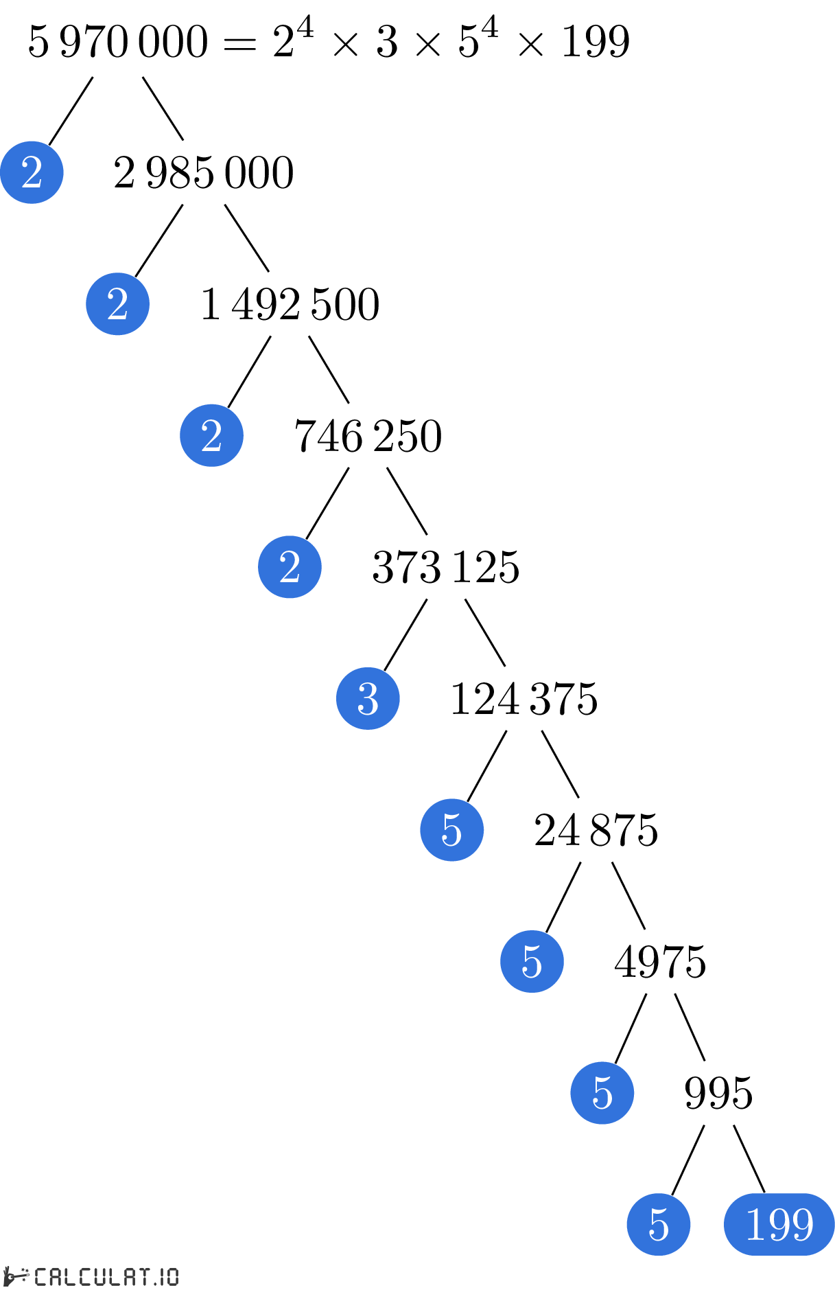 Для того, чтобы получить список простых множителей числа 5970000, необходимо итеративно делить число 5970000 на минимально возможное простое число пока в результате не получится 1 (единица).