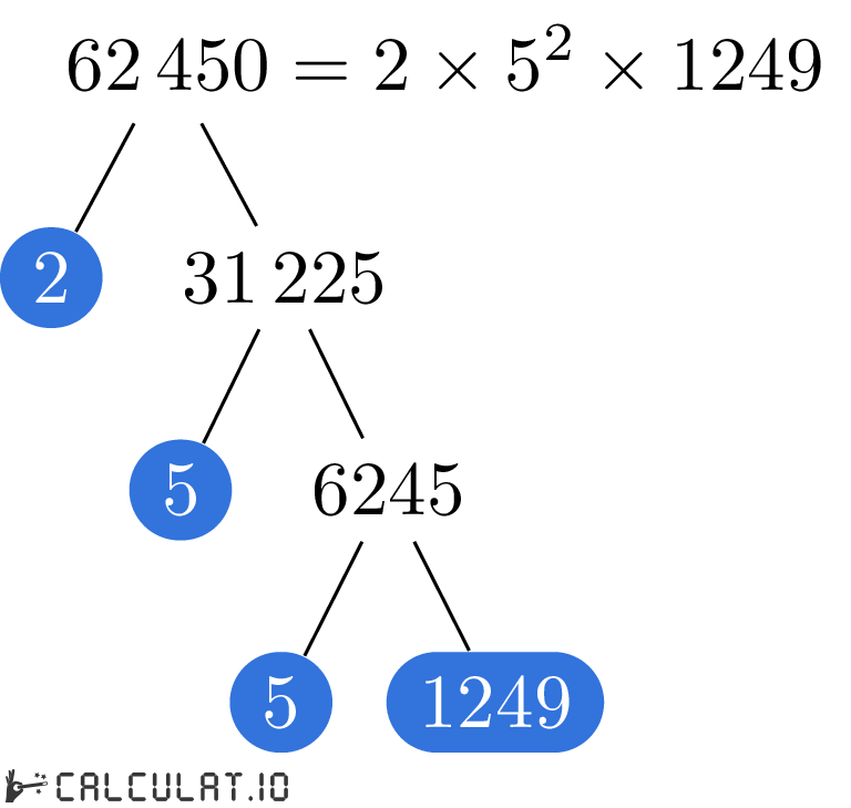 Для того, чтобы получить список простых множителей числа 62450, необходимо итеративно делить число 62450 на минимально возможное простое число пока в результате не получится 1 (единица).