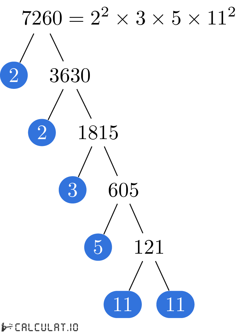 Для того, чтобы получить список простых множителей числа 7260, необходимо итеративно делить число 7260 на минимально возможное простое число пока в результате не получится 1 (единица).