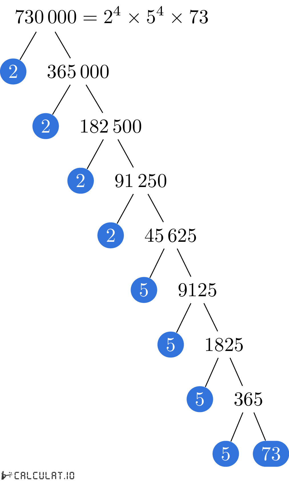 Для того, чтобы получить список простых множителей числа 730000, необходимо итеративно делить число 730000 на минимально возможное простое число пока в результате не получится 1 (единица).