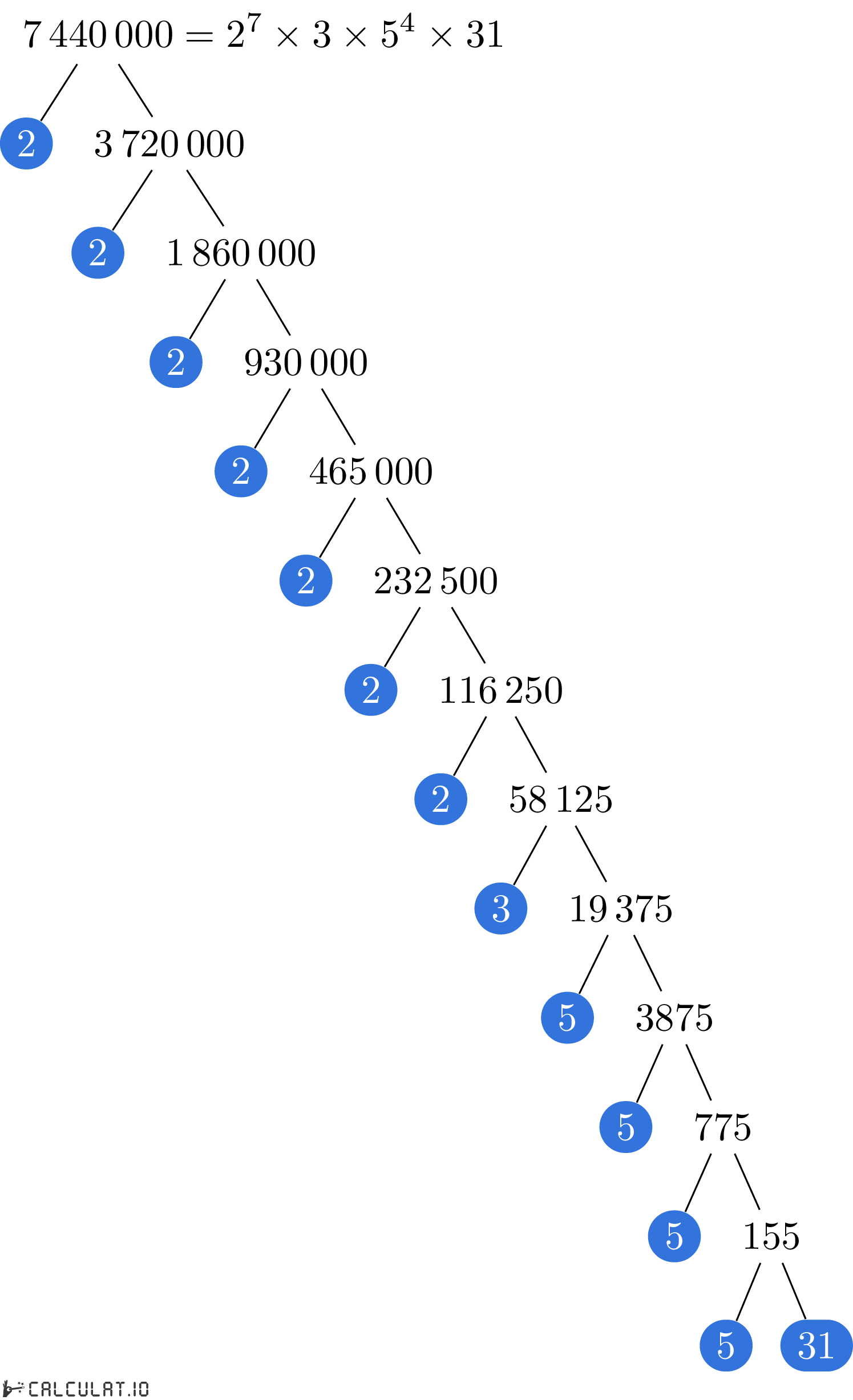 Для того, чтобы получить список простых множителей числа 7440000, необходимо итеративно делить число 7440000 на минимально возможное простое число пока в результате не получится 1 (единица).