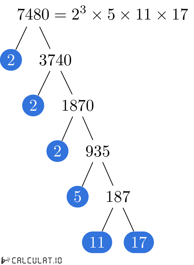 Для того, чтобы получить список простых множителей числа 7480, необходимо итеративно делить число 7480 на минимально возможное простое число пока в результате не получится 1 (единица).