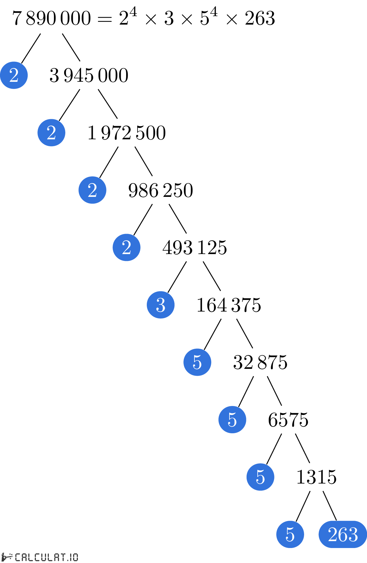 В итоге мы получили список всех простых множителей числа 7890000. Это: 2, 2, 2, 2, 3, 5, 5, 5, 5, 263
