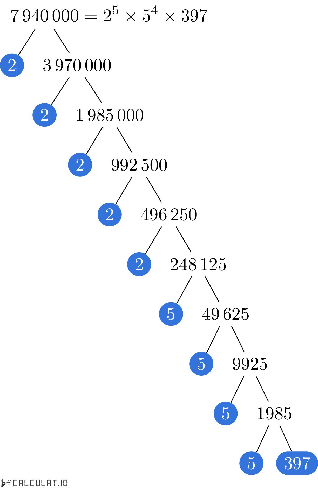 В итоге мы получили список всех простых множителей числа 7940000. Это: 2, 2, 2, 2, 2, 5, 5, 5, 5, 397