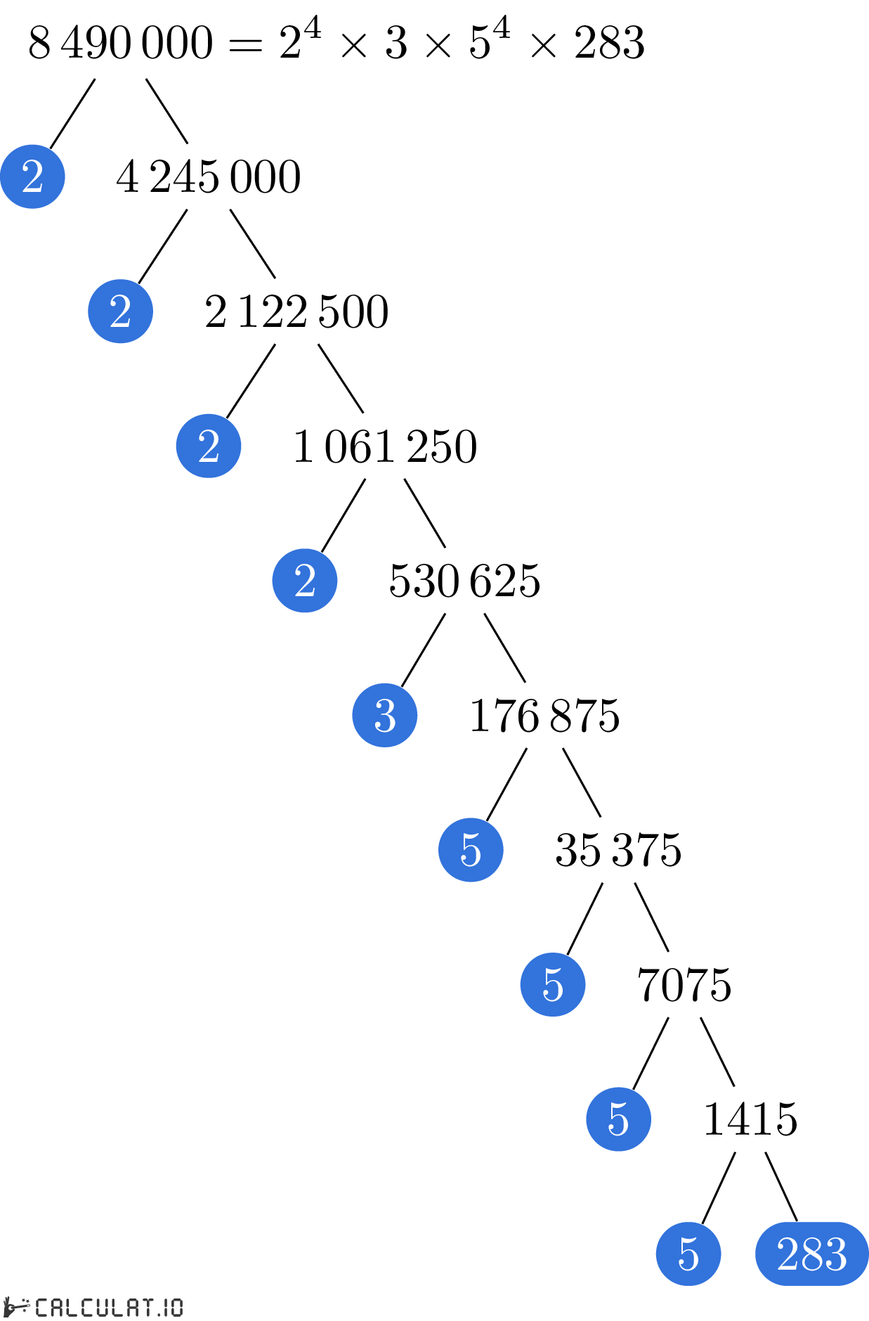 В итоге мы получили список всех простых множителей числа 8490000. Это: 2, 2, 2, 2, 3, 5, 5, 5, 5, 283