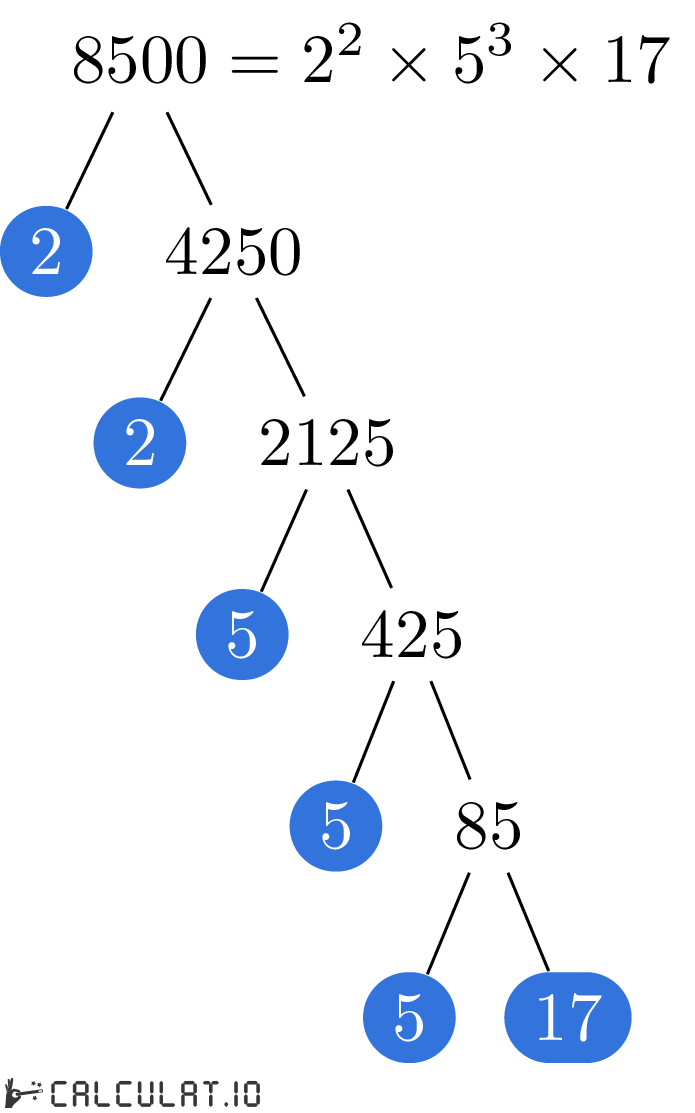 Для того, чтобы получить список простых множителей числа 8500, необходимо итеративно делить число 8500 на минимально возможное простое число пока в результате не получится 1 (единица).