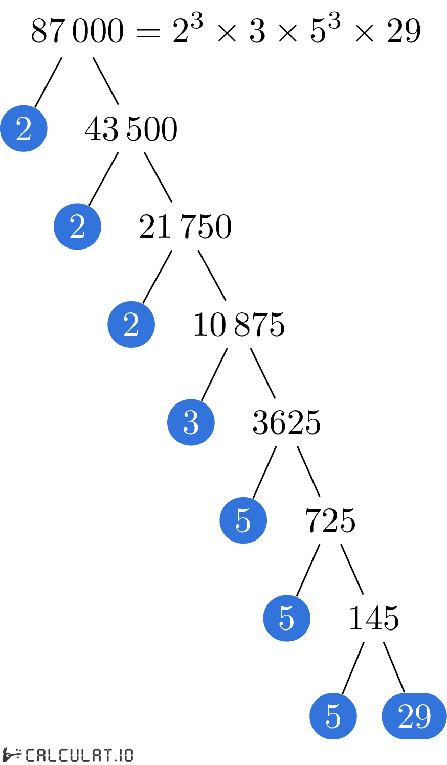 Для того, чтобы получить список простых множителей числа 87000, необходимо итеративно делить число 87000 на минимально возможное простое число пока в результате не получится 1 (единица).