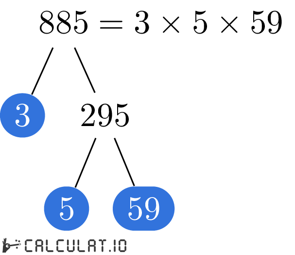 Для того, чтобы получить список простых множителей числа 885, необходимо итеративно делить число 885 на минимально возможное простое число пока в результате не получится 1 (единица).