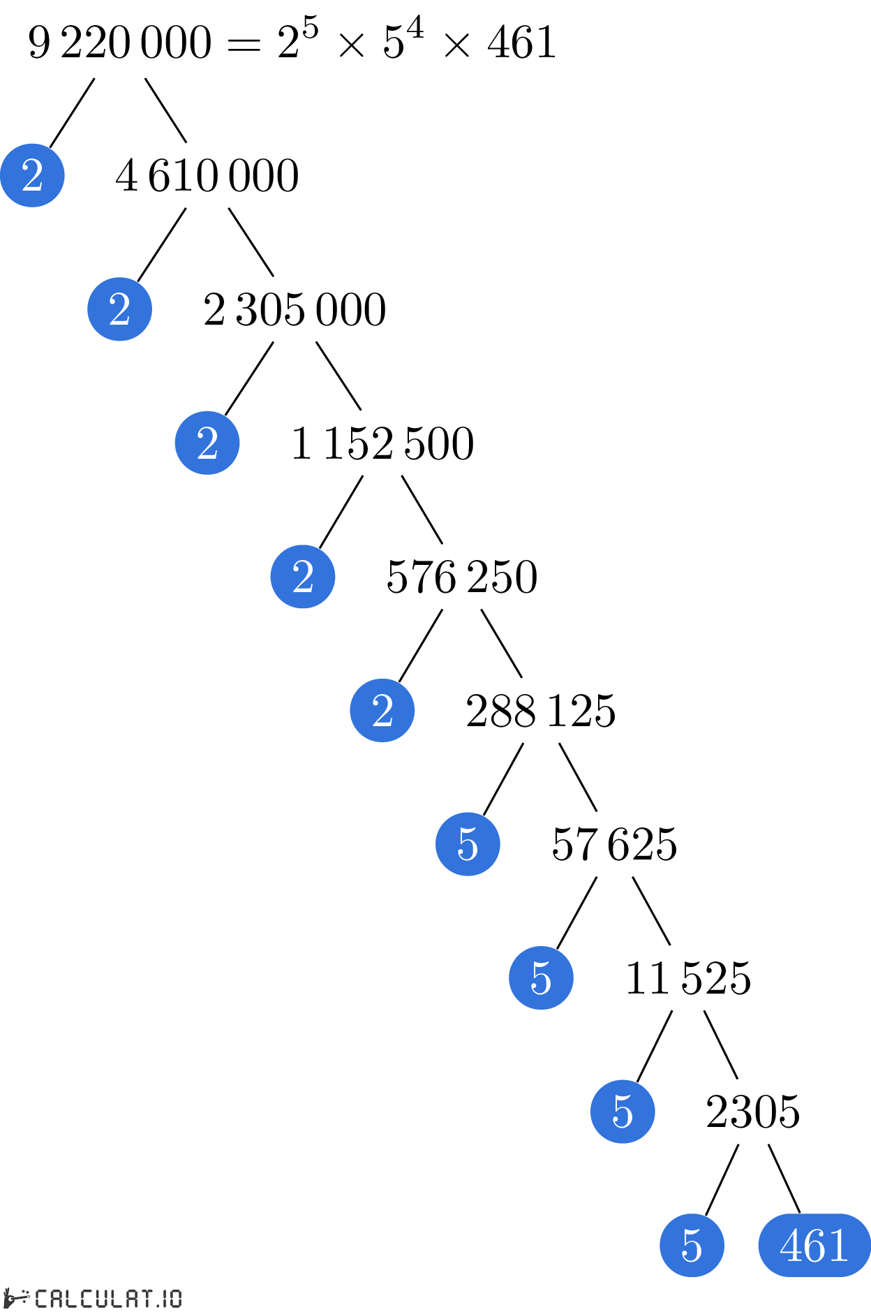 Разложение 9220000 на простые множители (факторизация) - это представление числа 9220000 как произведения простых чисел. Другими словами, необходимо выяснить, какие простые числа нужно перемножить, чтобы получилось число 9220000.