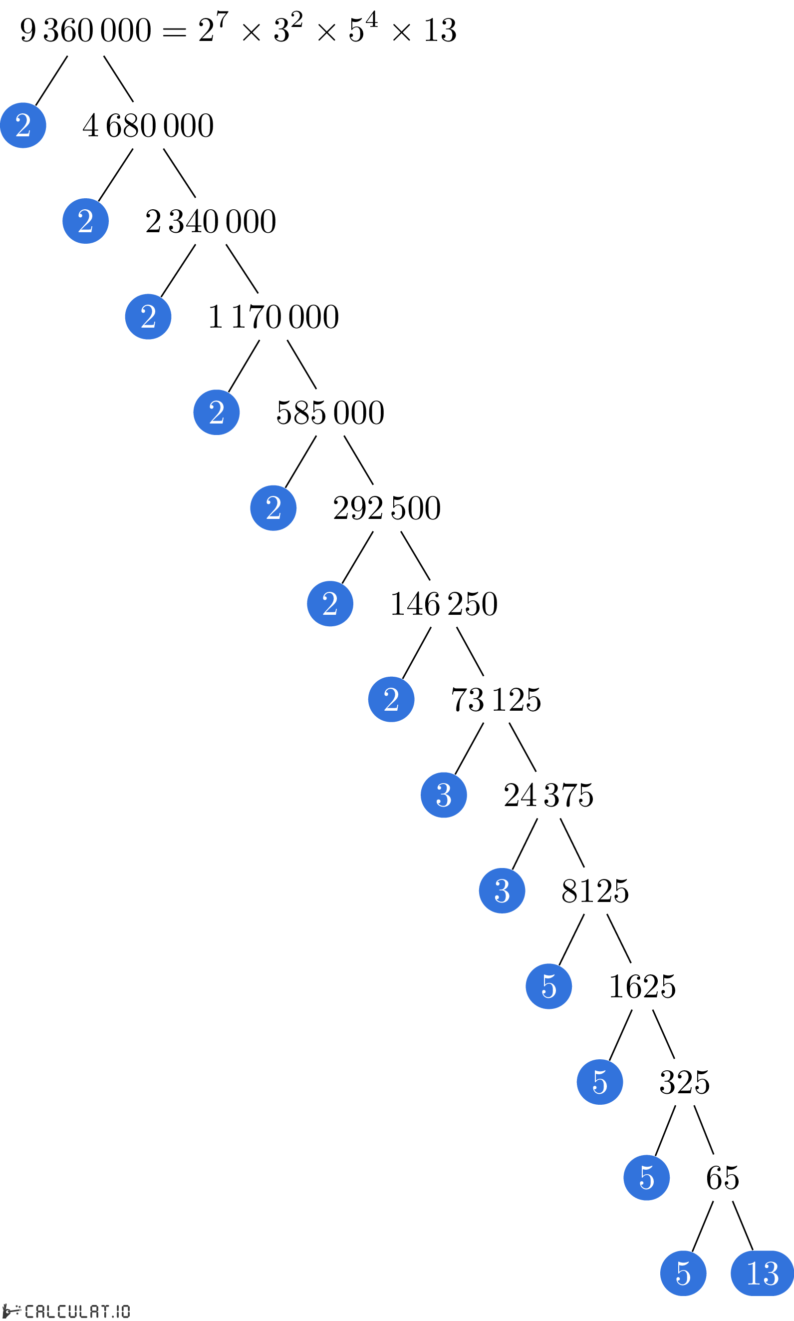 Для того, чтобы получить список простых множителей числа 9360000, необходимо итеративно делить число 9360000 на минимально возможное простое число пока в результате не получится 1 (единица).