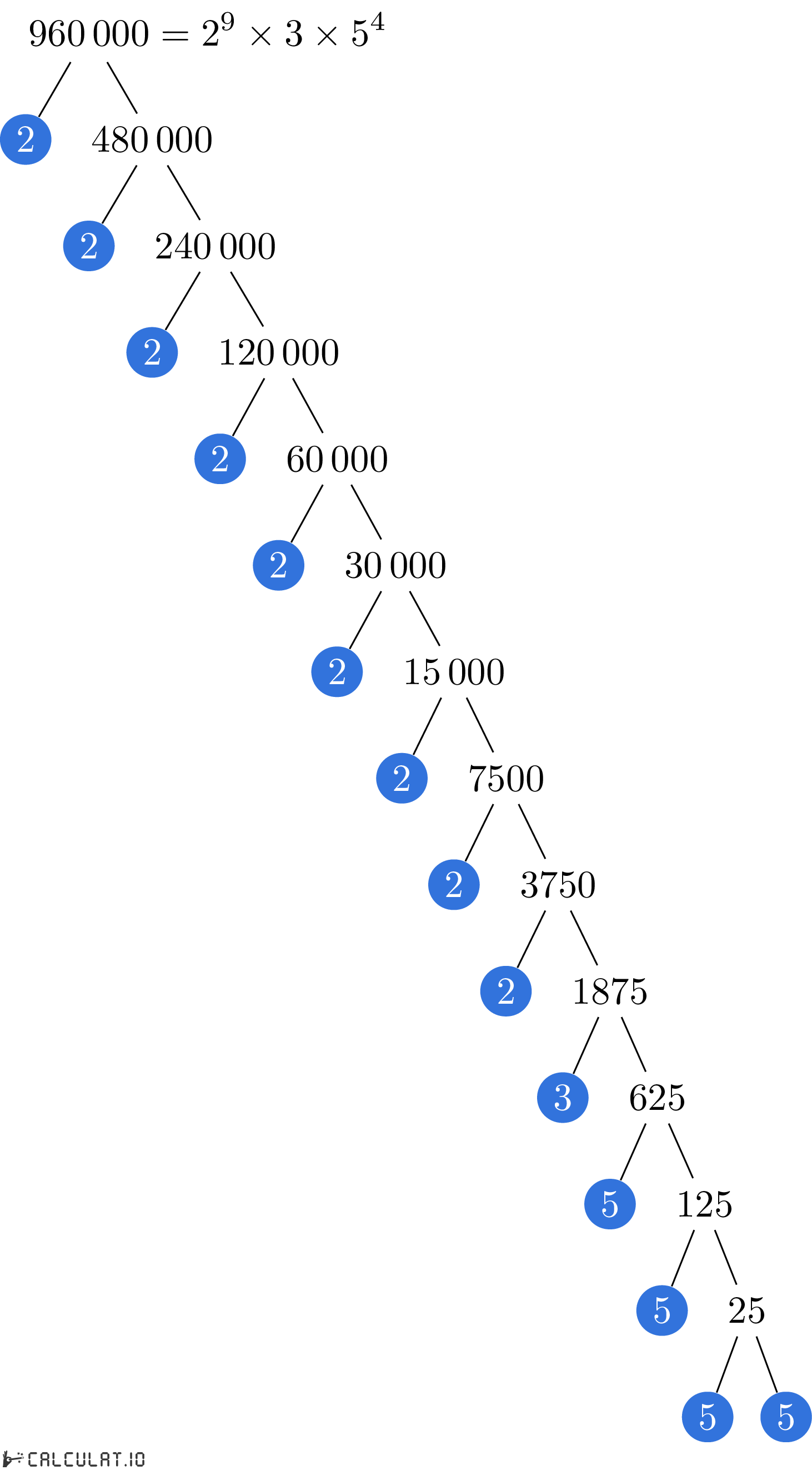 Для того, чтобы получить список простых множителей числа 960000, необходимо итеративно делить число 960000 на минимально возможное простое число пока в результате не получится 1 (единица).