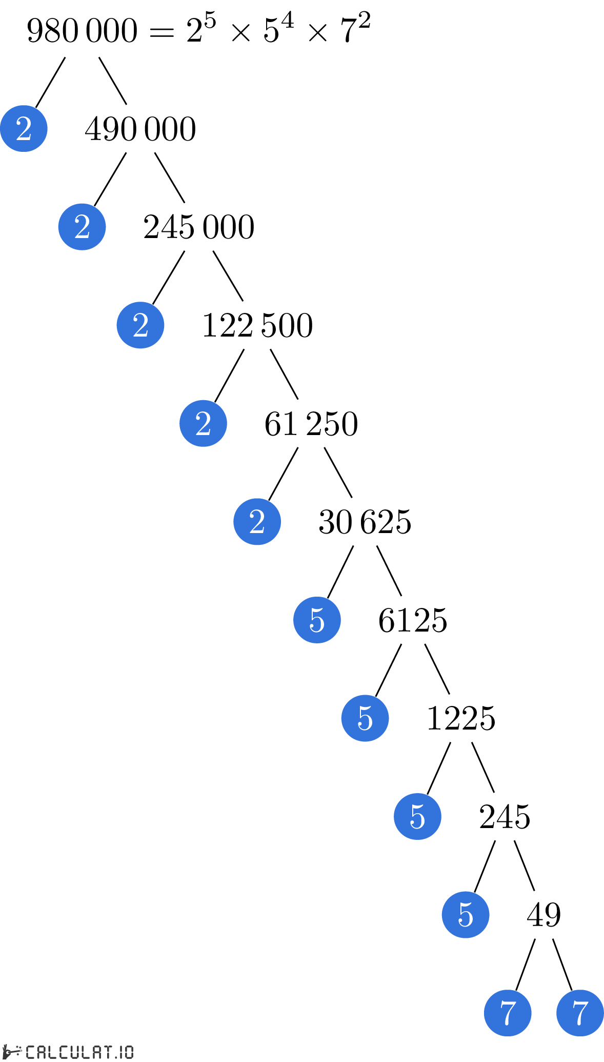В итоге мы получили список всех простых множителей числа 980000. Это: 2, 2, 2, 2, 2, 5, 5, 5, 5, 7, 7