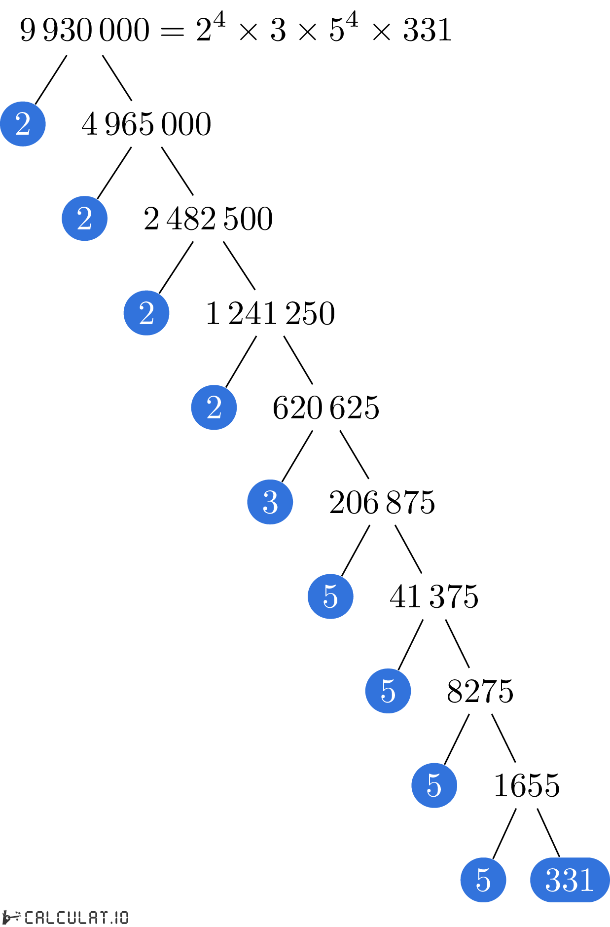 Для того, чтобы получить список простых множителей числа 9930000, необходимо итеративно делить число 9930000 на минимально возможное простое число пока в результате не получится 1 (единица).