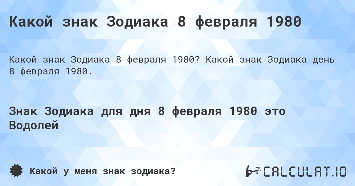 - Знак Зодиака для дня 8 февраля 1980 это Водолей (aquarius)
